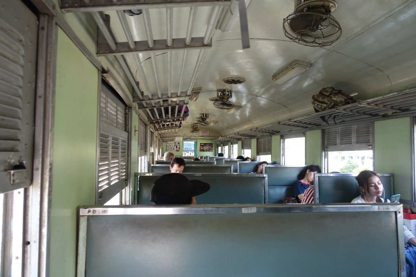 Der Zug, mit selbstgemaltem Pappschild angekündigt, fährt unerwartet pünktlich ab. Er rattert aus Bangkok hinaus haarscharf an den Holzhütten vorbei. Die offenen Fenster und das monotone Rattern ist angenehm und sorgt dafür, dass nach kurzer Zeit fast alle Passagiere anfangen zu schlafen.