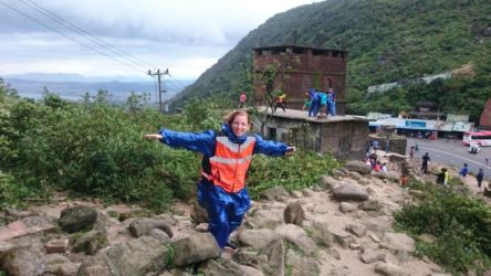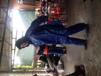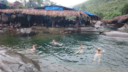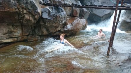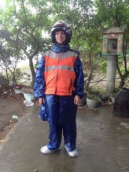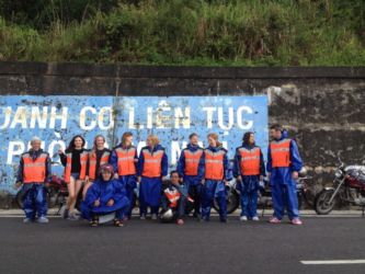 Die Gegend zwischen Hue und Hoi An ist nicht nur historisch interessant, sondern beherbergt mit dem „Wolkenpass“ die natürliche Wettergrenze zwischen der südlichen und nördlichen Klimazone. Da es in inzwischen einen Tunnel durch den Berg gibt, durch welchen der Schwerverkehr und die meisten Autos geleitet werden, ist diese Strecke über den Pass für Touren, wie wir sie vorhaben machen, hervorragend geeignet. Wir starten in Hue mit der Fahrt durch recht frisch gesetzte Reisfelder, die saftig grün leuchten. Dann beginnt es leider zu regnen und wir werden allesamt liebevoll in Plastik verpackt und sehen anschließend aus, als wären wir eine Spezialeinheit zur Beseitigung von Gefahrenstoffen. Erster Stopp in voller Montur ist ein kleines Fischerdorf. Die Fischer kennen den Aufzug wohl schon und sind wenig beeindruckt. Viel zu sehen gibt es hier nicht, was aber vermutlich am strömenden Regen liegt. Weiter geht’s! Der nächste Stopp wird uns als schöne Badegelegenheit angepriesen. Bei dem Regen ist anfangs keiner so recht begeistert, aber als wir an der „Elefant Spring“ ankommen, hopsen dann schließlich doch einige von uns in die Fluten. Bei Sonnenschein muss dieser Platz großes Kino sein: neben der Quelle gibt es auf den platten Felsen mehrere überdachte Sitzmöglichkeiten. Hier verbringen Scharen von Vietnamesen ihre Freizeit, essen, trinken Dosenbier und nebenher läuft laute Musik. Unsere Motorradgang-Anführerin Sue, die die Gruppe der Easyrider-Jungs wunderbar im Griff hat, versorgt uns nach dem Baden, wie schon vorher sehr gut organisiert, mit allem, was man bei solch einem Stopp braucht: in diesem Fall einer Dose Bier und einer Plastiktüte für die nassen Klamotten.