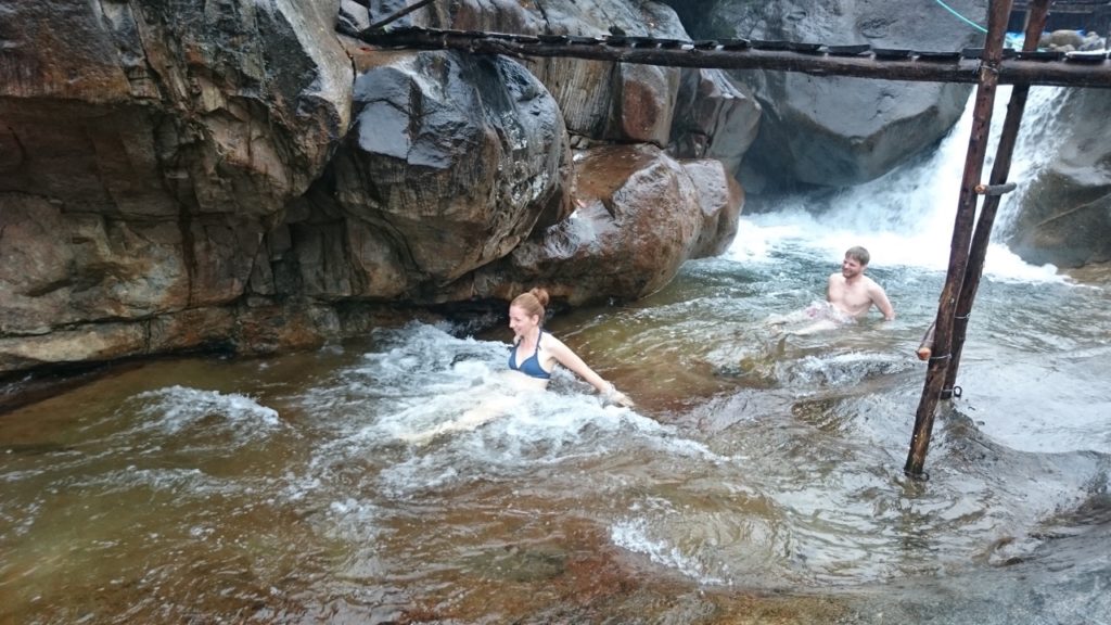 Die Gegend zwischen Hue und Hoi An ist nicht nur historisch interessant, sondern beherbergt mit dem „Wolkenpass“ die natürliche Wettergrenze zwischen der südlichen und nördlichen Klimazone. Da es in inzwischen einen Tunnel durch den Berg gibt, durch welchen der Schwerverkehr und die meisten Autos geleitet werden, ist diese Strecke über den Pass für Touren, wie wir sie vorhaben machen, hervorragend geeignet. Wir starten in Hue mit der Fahrt durch recht frisch gesetzte Reisfelder, die saftig grün leuchten. Dann beginnt es leider zu regnen und wir werden allesamt liebevoll in Plastik verpackt und sehen anschließend aus, als wären wir eine Spezialeinheit zur Beseitigung von Gefahrenstoffen. Erster Stopp in voller Montur ist ein kleines Fischerdorf. Die Fischer kennen den Aufzug wohl schon und sind wenig beeindruckt. Viel zu sehen gibt es hier nicht, was aber vermutlich am strömenden Regen liegt. Weiter geht’s! Der nächste Stopp wird uns als schöne Badegelegenheit angepriesen. Bei dem Regen ist anfangs keiner so recht begeistert, aber als wir an der „Elefant Spring“ ankommen, hopsen dann schließlich doch einige von uns in die Fluten. Bei Sonnenschein muss dieser Platz großes Kino sein: neben der Quelle gibt es auf den platten Felsen mehrere überdachte Sitzmöglichkeiten. Hier verbringen Scharen von Vietnamesen ihre Freizeit, essen, trinken Dosenbier und nebenher läuft laute Musik. Unsere Motorradgang-Anführerin Sue, die die Gruppe der Easyrider-Jungs wunderbar im Griff hat, versorgt uns nach dem Baden, wie schon vorher sehr gut organisiert, mit allem, was man bei solch einem Stopp braucht: in diesem Fall einer Dose Bier und einer Plastiktüte für die nassen Klamotten.