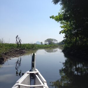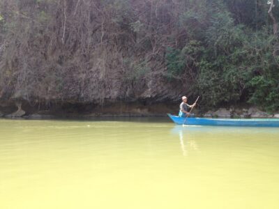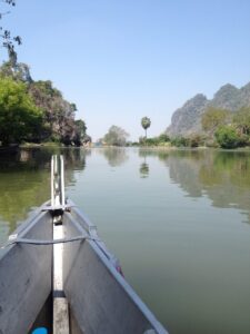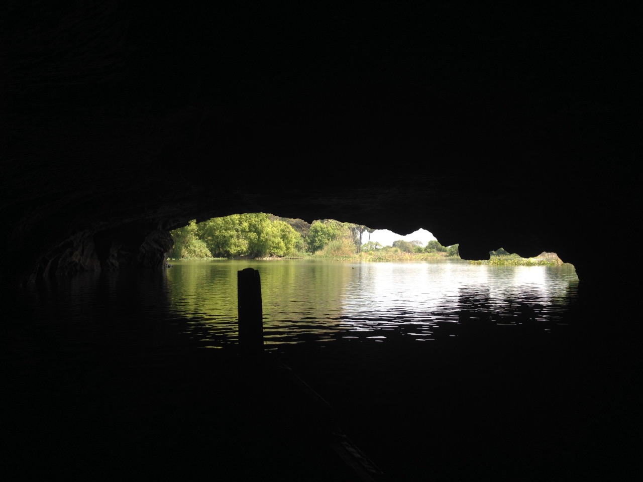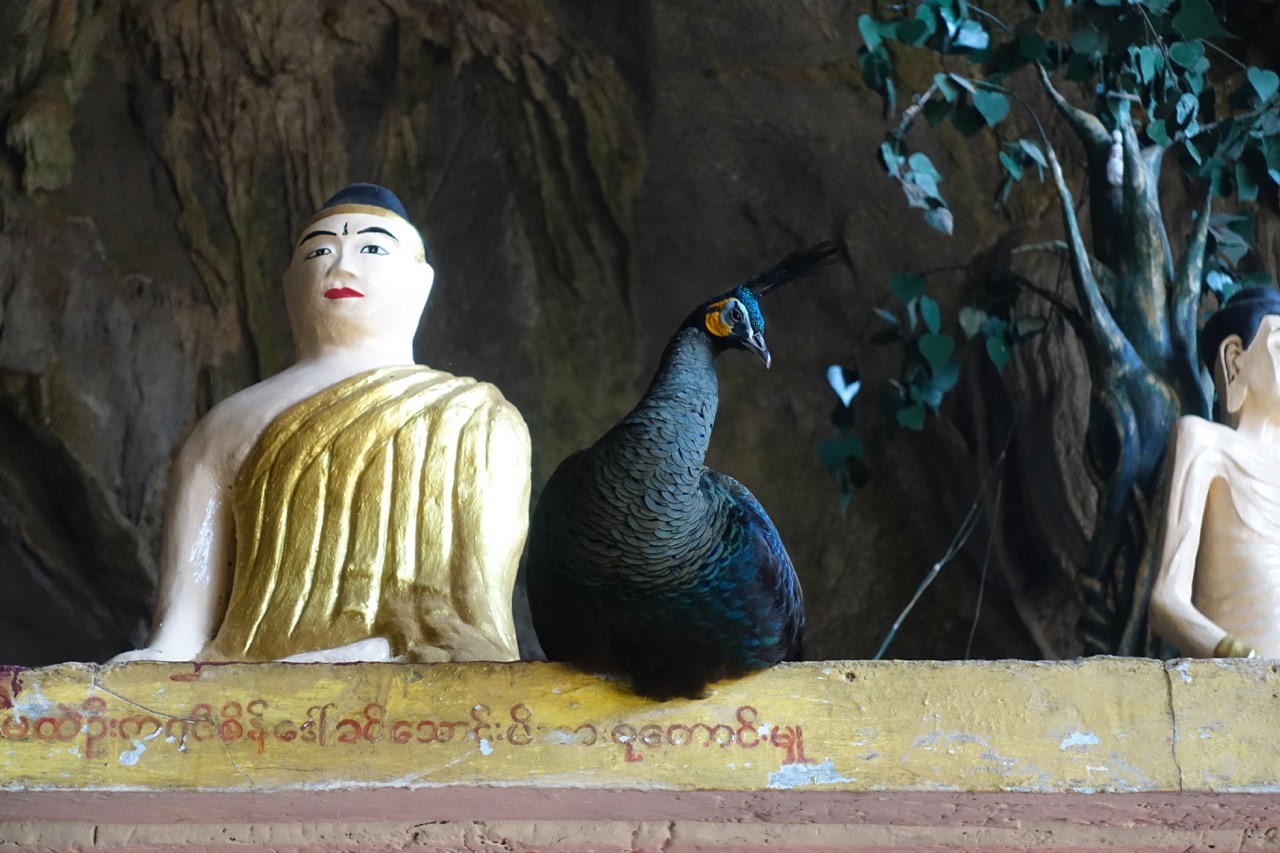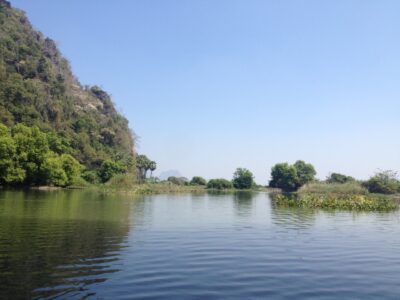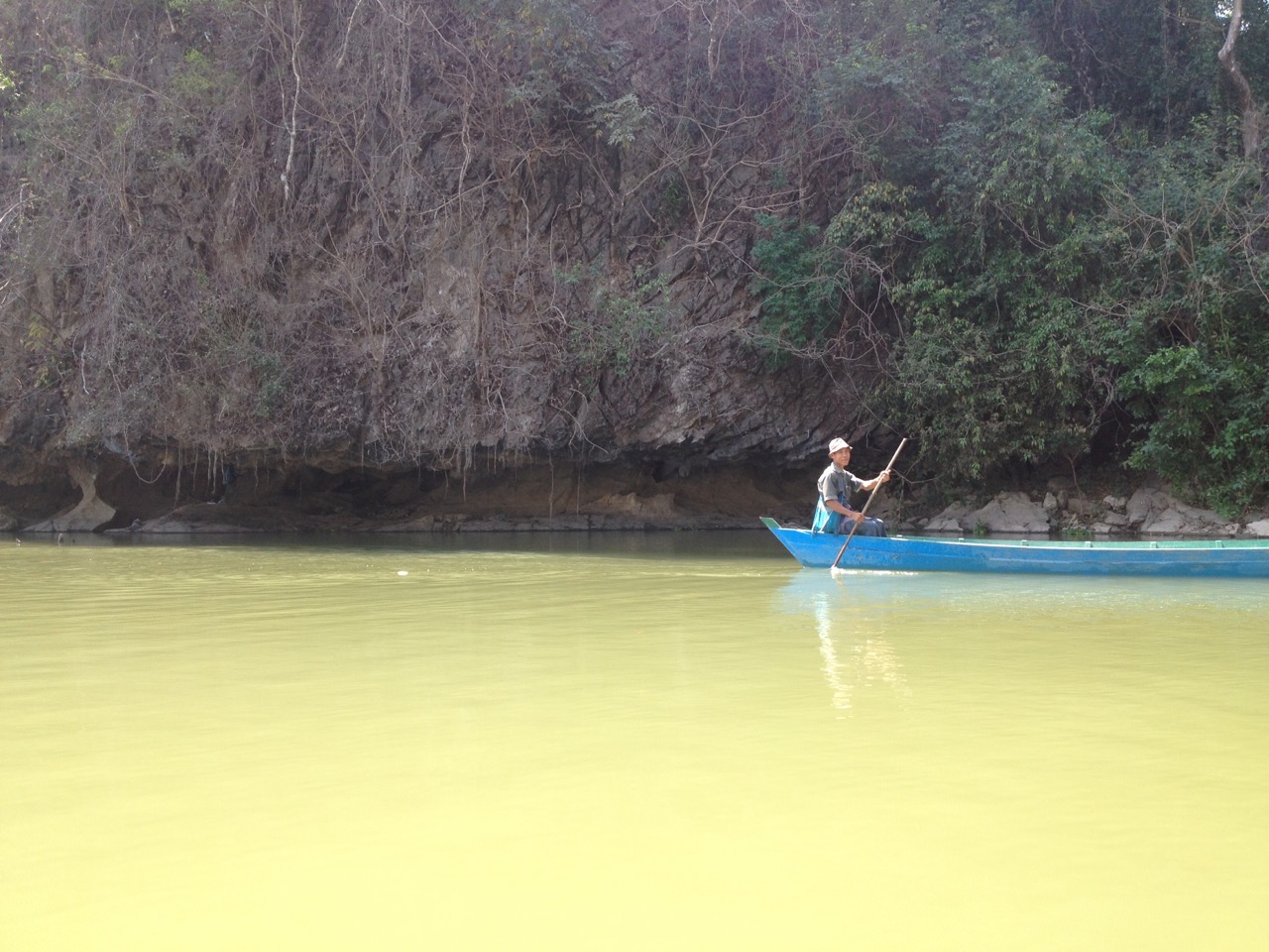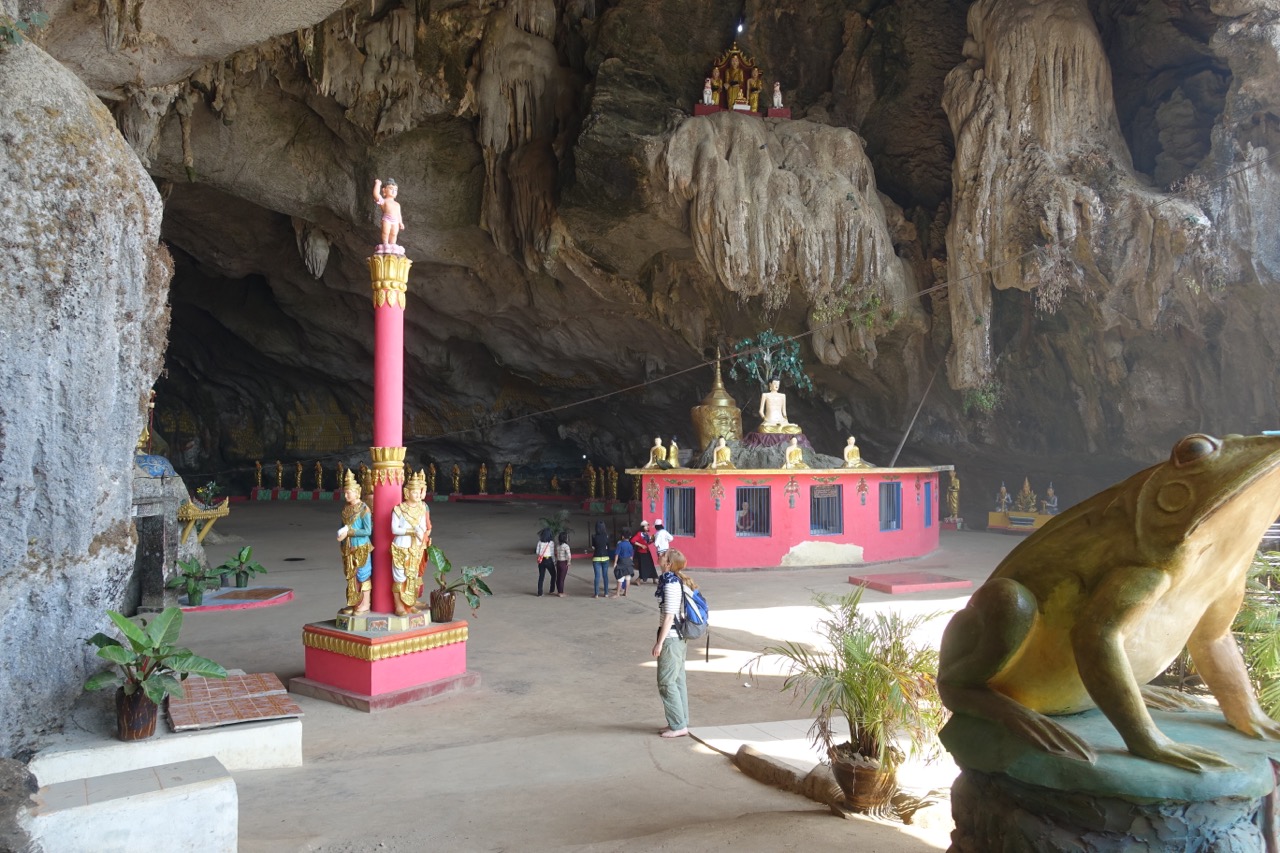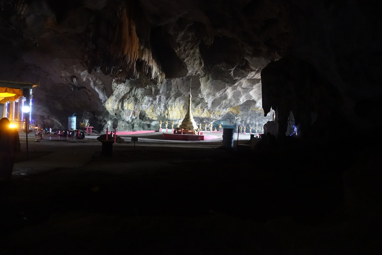Nach einer guten Stunde haben wir mit der Saddan-Höhle unser erstes Ziel erreicht. Diese größte Höhle in der Gegend ist wirklich beeindruckend – im vorderen Teil wurde in das Höhlengewölbe eine Tempelanlage mit einer kleinen Pagoden und verschiedenen Buddhas, die durch farbige Neonlichter und Lichtorgeln angestrahlt werden, eingebaut. Im hinteren Teil des Gewölbes führt ein Weg immer tiefer in den Berg. Man möchte zwischenzeitlich umkehren so laut ist das Geräusch der Fledermäuse dort und der Gestank ihres Kots…nicht zu vergessen, wir befinden uns auf heiligem Boden und sind deswegen barfuß unterwegs. Nach knapp 1 km wartet dann eine Überraschung, das Gewölbe öffnet sich wieder und der Blick fällt auf einen kleinen See direkt am hinteren Ausgang. Auf dem See sind Fischer unterwegs und am Ufer bzw. den Kanälen, die von diesem abgehen, wird Reis angebaut. Mit einem länglichen Holzkahn lassen wir uns ganz gemächlich auf diesem Richtung Haupteingang transportieren und genießen die Ruhe, die durch das friedliche Schippern entsteht.