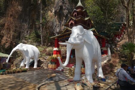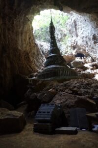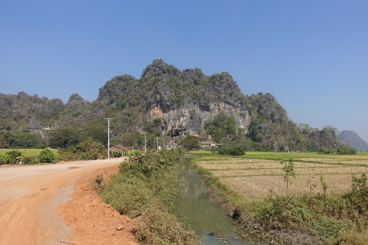 Eigentlich wollten wir noch weitere Höhlen und natürliche Sehenswürdigkeiten bewundern, aber leider zeigt die Hitze auch bei mir schon die ersten Auswirkungen – ein kleiner Sonnenstich macht sich bemerkbar und deswegen machen wir uns auf den Rückweg nach Hpa-An. Unterwegs stoppen wir nur kurz am Fuße des Mount Zwegabin, auf dessen 800 m hohen Gipfel eine Klosteranlage steht, die man besichtigen und in der normalerweise sogar übernachten kann.