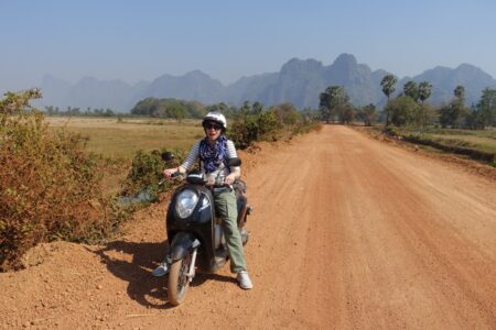 Und tatsächlich, das Rollerfahren ist die reinste Gaudi – wir fahren im Morgendunst zwischen den grün bewachsenen Karstbergen durch, vorbei an steil aufragenden Felsen. Später biegen wir auf einen holprigen Schotterweg ab, der uns durch meist abgeerntete Reisfelder und kleine Bauerndörfer mit Brunnen und Heuhaufen führt. Man merkt ganz deutlich, dass hier die Hitzeperiode angefangen hat – nur das, was direkt am Wasser angebaut wird, blüht, alles andere liegt ausgedörrt brach. Sobald man mit den Rollern anhält, merkt man die sengende Hitze, die gefühlte Temperatur liegt bei knapp 38 Grad.
