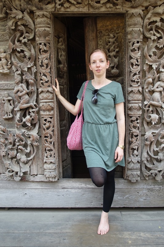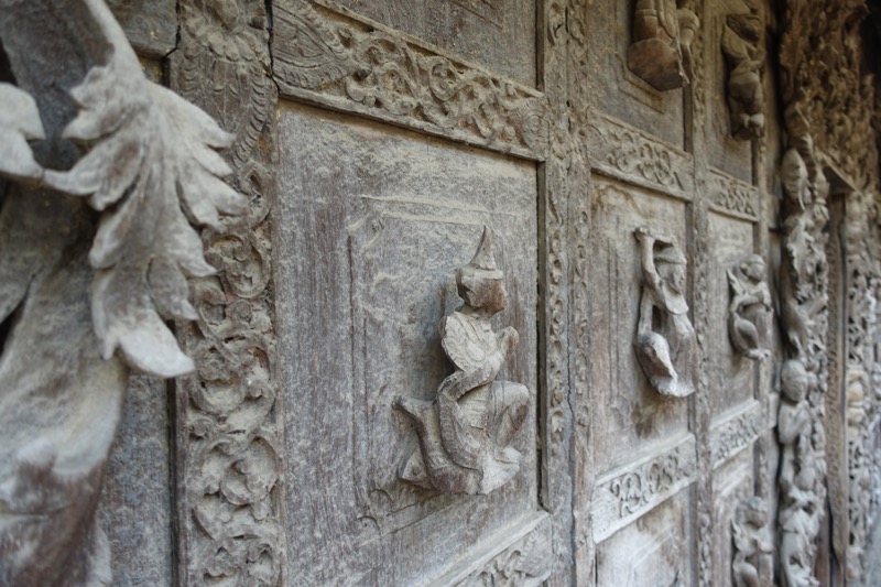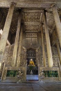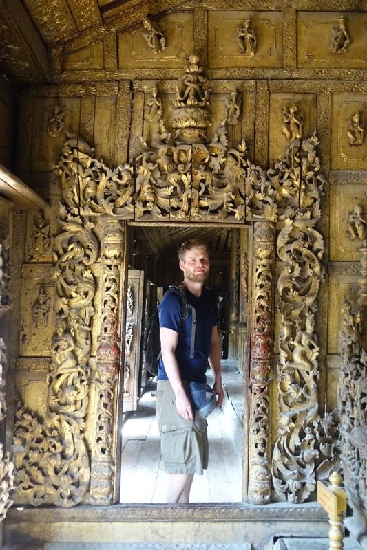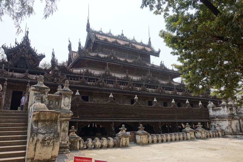 Diese Entscheidung war aber goldrichtig, denn das Shwenandaw Kyaung-Kloster, von dessen Besuch innen er uns abgeraten hat, entpuppt sich als wunderschön und sehr interessant. Dieses Bauwerk ist schließlich das einzig Originalstück, welches aus dem alten Königspalast erhalten geblieben ist. Es diente ursprünglich als Schlafgemach des Königs Mindon. Als dieser 1878 starb ließ es sein Sohn König Thibaw aus dem Palast entfernen und als Kloster umfunktionieren, angeblich um den Schatten seines Vaters zu entkommen. So entging es im Gegensatz zum Königsplatz den Bomben im 2. Weltkrieg.