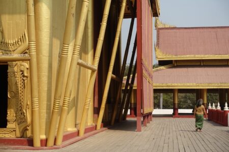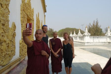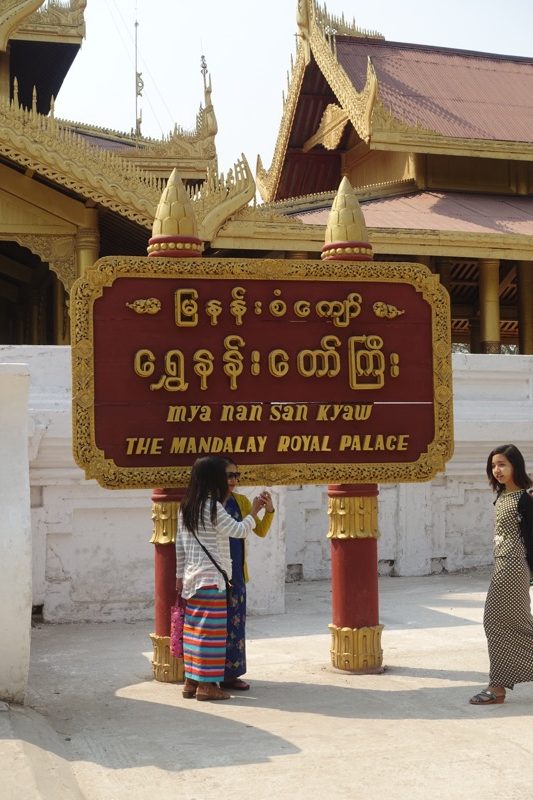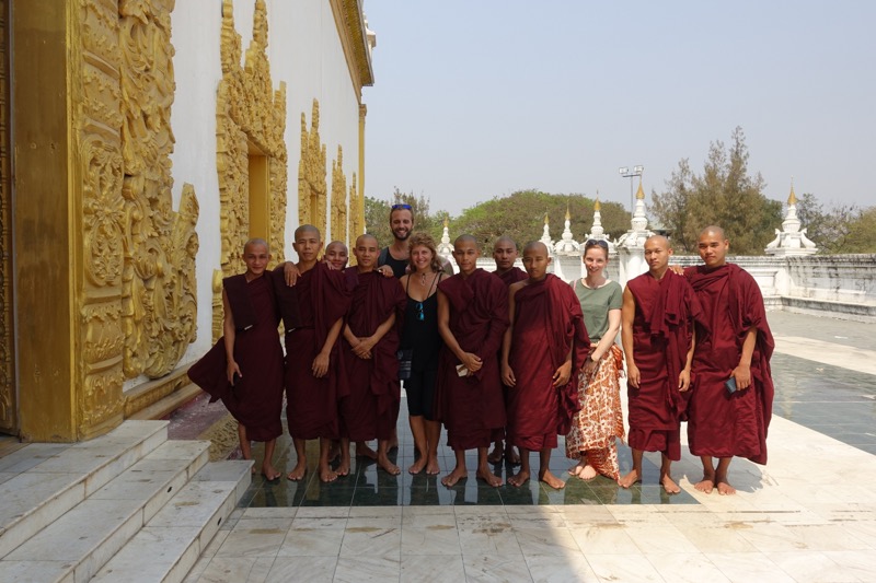 Im weiteren Verlauf des Tages haben wir noch ein lustiges Fotoshootings mit einer Gruppe junger Mönche – man konnte gar nicht sagen, wer mehr fasziniert vom Gegenüber war! Wir besichtigen zum Missfallen von Ali auch die anderen touristischen Sehenswürdigkeiten, wie den knapp 500 bis 900 Tonnen schweren Marmor-Buddha in der Kyauktawgyi-Pagode und die Nachbildung des Königpalast. Dieser befindet sich am Originalplatz in einem riesigen Komplex im Norden der Stadt, welcher heutzutage auch militärisch genutzt wird. Der Besuch ist insofern befremdlich, da man am Eingang seinen Pass hinterlassen muss und schwerbewaffnete Militärs darauf hinweisen, dass man auf dem Weg zum Palast keinerlei Fotos machen darf. Der Palast selbst ist leider nicht sonderlich gut gelungen, die unzähligen Gebäude sind aus getünchtem Beton und Wellblech nachgebaut und es kommt so sehr wenig Atmosphäre auf. Gerade Mechthild ist enttäuscht, da sie den Roman „Glaspalast“ gelesen hat, der zur Zeit des letzten Königs in Mandalay spielt und der prachtvolle Palast ein Rolle spielt.