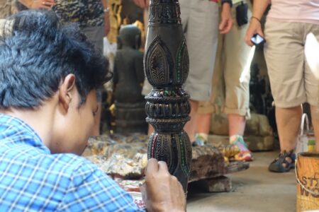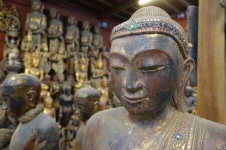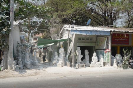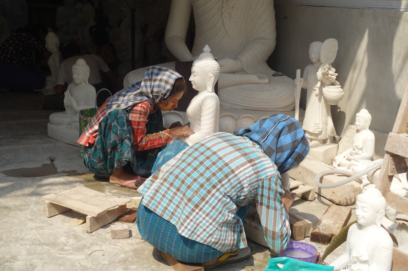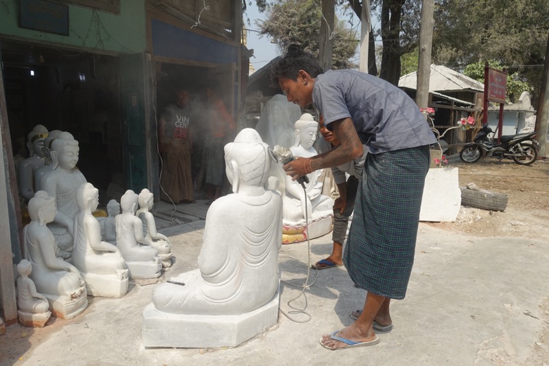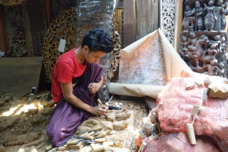 Vor unser Weiterreise besichtigen wir am kommenden Tag noch kurz einige Handwerksstätten, die am Vortag (Sonntag) geschlossen waren. So sehen wir Holz- und Steinbildhauereien, die weniger für Touristen, als für Klöster und Pagoden anfertigen. außerdem eine Manufaktur für die Herstellung der hauchdünnen Goldplättchen. Diese werden von den Gläubigen im ganzen Land an Statuen und Symbolen wie dem Golden Rock angebracht werden.