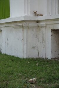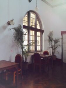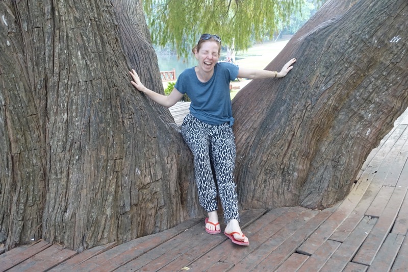 Wir schnappen uns also Fahrrädern aus der Unterkunft und erkunden das Städtchen. Es ist irgendwie lustig hier in Myanmar Rad zu fahren, aber herrlich entspannt und hat was von Freiheit. Die heutige Unterkunft ist für unsere bisherige Reise sehr ungewöhnlich: Wir übernachten auf dem Grundstück und in den Gebäuden der ehemaligen englischen Bezirksgouverneure. Die 1921 errichtete Anlage wirkt wie in die Jahre gekommenes Englisch anmutendes Landgut und hat sich ihren Charme erhalten, da sie kaum renoviert scheint. Das Mobiliar der Häuser hat etwas von dem einer alten Jugendherberge der 50er. Wir haben ein riesiges Zimmer mit Vorraum und Schreibtisch mit Blick auf den Garten und laufen beim Verlassen des Gebäudes erst einmal in die Dreharbeiten für eine burmesische Daily Soap…