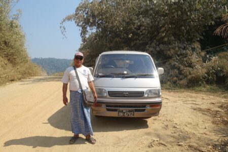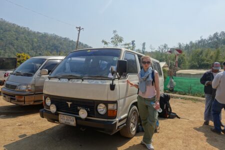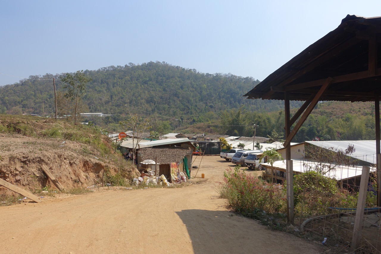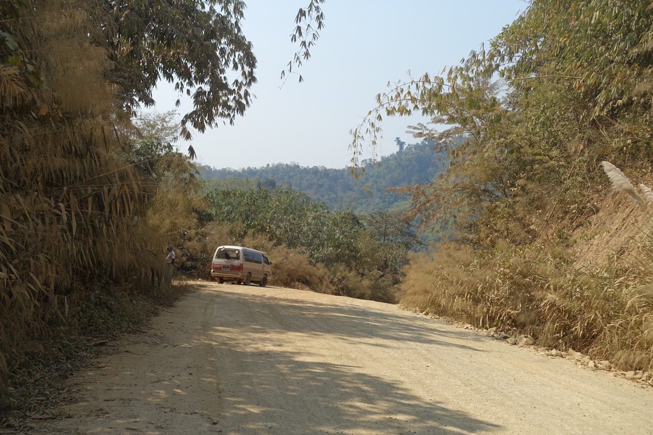 Deswegen nimmt neben uns schließlich nur ein deutsch-japanischem Pärchen den 130 Kilometer langen Ritt nach Myanmar auf sich. In einem Minibus schaukeln wir 4-5 Stunden über eine Schotterpiste durch das bergige Hinterland, die Landschaft wirkt mehr oder weniger unberührt, man begegnet nur ab und zu Militärposten, kleinen Bauernhütten und Gaststätten. An einer dieser Gaststätten wird unser Magen auf die erste Probe gestellt, zum Mittagessen gibt es Reis mit einer undefinierbaren Art von Hühnchen, welches schon gut kalt ist…