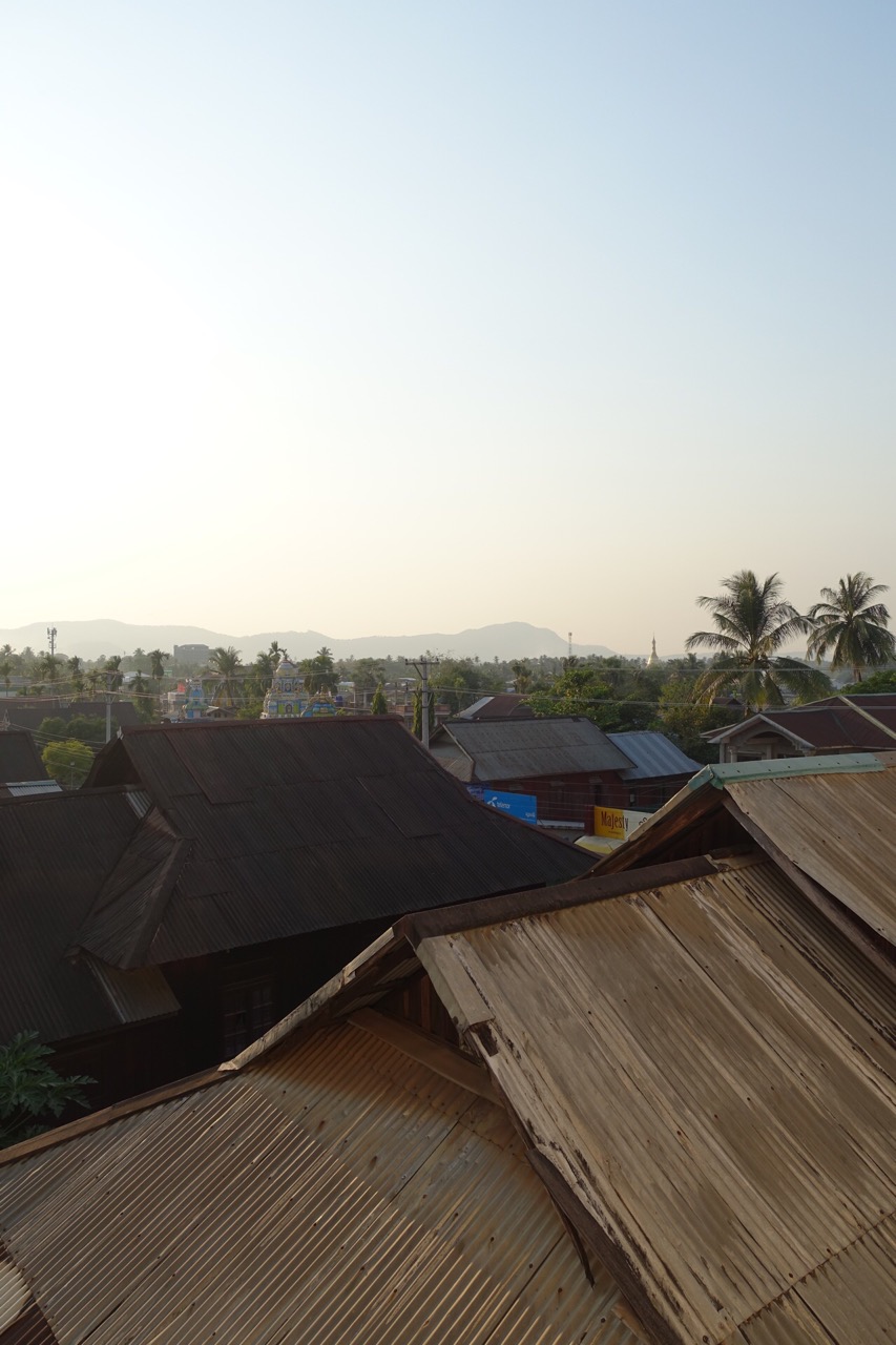 Nach einiger Zeit geht einem die Schaukelei mit 30 Km/h ganz schön auf die Nerven, so dass wir trotz der schönen Landschaft am Ende froh sind, in Dawei zu landen. Unser Hotel liegt etwas außerhalb des Stadtzentrums und ist sauber, versprüht aber den Charme eines sowjetischen Studentenwohnheims…wozu der ausgeschaltete Metalldetektor im ersten Stock dienen sollte, bleibt uns aber bis zum Ende ein Rätsel.