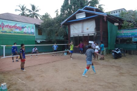 Die Menschen sind hilfsbereit und freundlich, kleine Kinder winken einem zu und freuen sich total, wenn man ihnen zurückwinkt und auch sonst hat man trotz einsetzender Dunkelheit und langem Fußmarsch nie das Gefühl von Unsicherheit. Westlichen Touristen begegnet man kaum, stattdessen bekommt man schon einen ersten kleinen Einblick in das Alltagsleben: Die männlichen Birmanen spielen in der Freizeit wohl gerne Fußballtennis, immer wieder sieht man Männer sich einen kleinen Korbball in der Luft zukicken und an einer Stelle gibt es ein richtiges Match auf einem öffentlichen Platz. Auch einer Hochzeitsgesellschaft begegnen wir, die Damen alle in farbenfrohen Seidenkleidern.